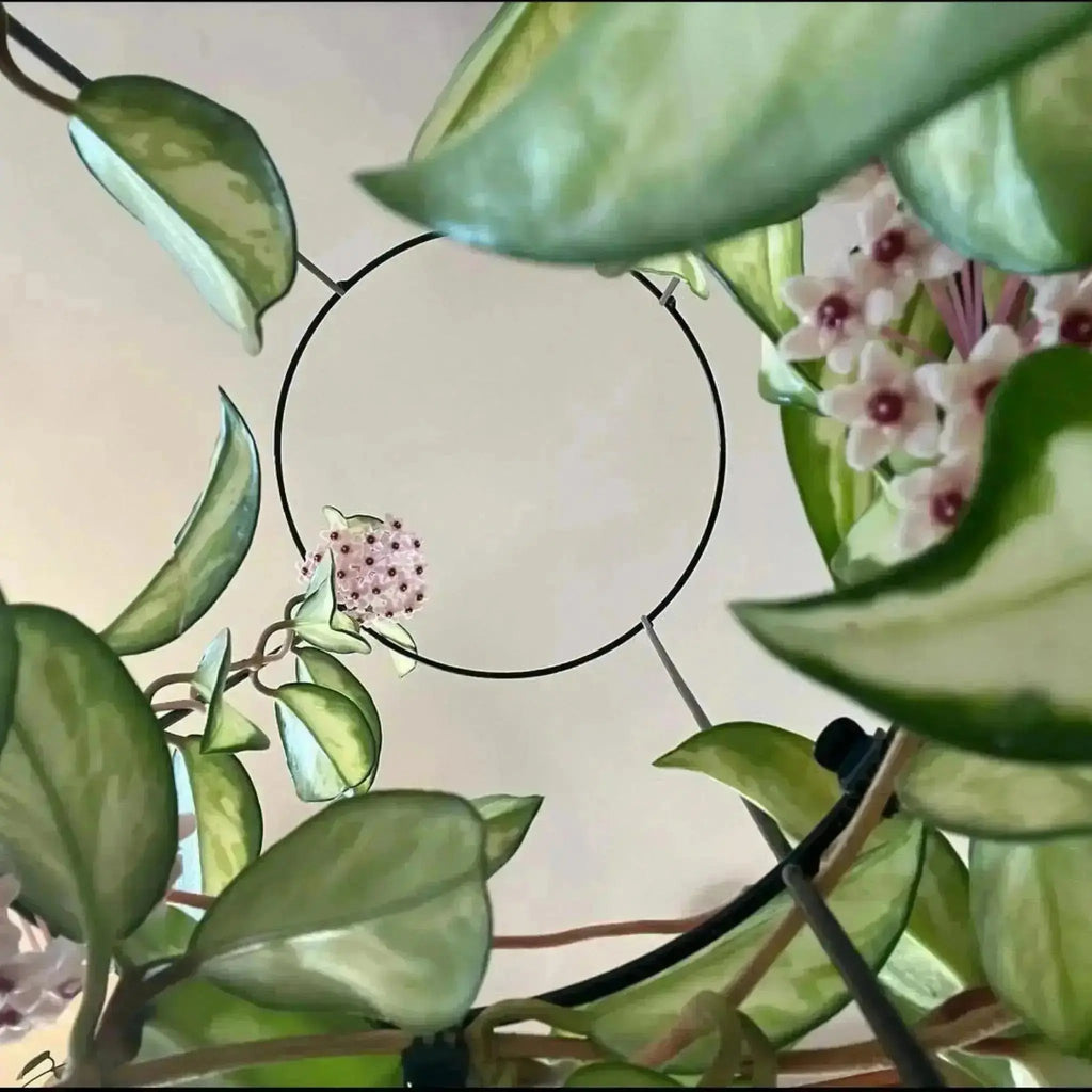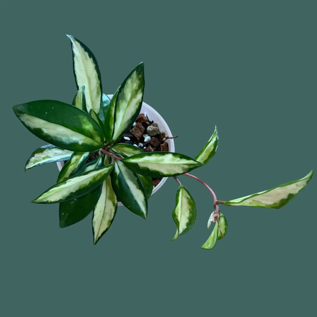 Hoya Krimson Princess, A variegated Hoya that needs bright filtered light an hour of sun will help this one bloom but not summers direct sun as this will burn the leaves, like most Hoya they love a chunky soil mix and water when dry.